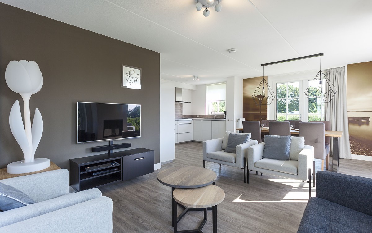 Dieses luxuriöse 8-Personen-Haus hat einen zentralen Eingang mit Toilette. Über den Flur gelangt man in das Wohnzimmer mit großzügiger Sitzecke und Gaskamin, Essbereich mit offener Küche. Ebenfalls im Erdgeschoss befindet sich ein Schlafzimmer mit 2 Einzelbetten und Badezimmer en suite mit Waschbecken und Dusche mit Sunshower. Im Obergeschoss befinden sich 3 Schlafzimmer und ein zentral gelegenes Badezimmer mit Badewanne mit Whirlpoolfunction und Dusche mit Sunshower, Sauna, Doppelwaschbecken und Toilette. In jedem Schlafzimmer gibt es 2x Einzelbetten. Bei Ankunft sind Ihre Betten bereits frisch bezogen. Direkt vor der Ferienvilla befinden sich zwei Stellplätze.