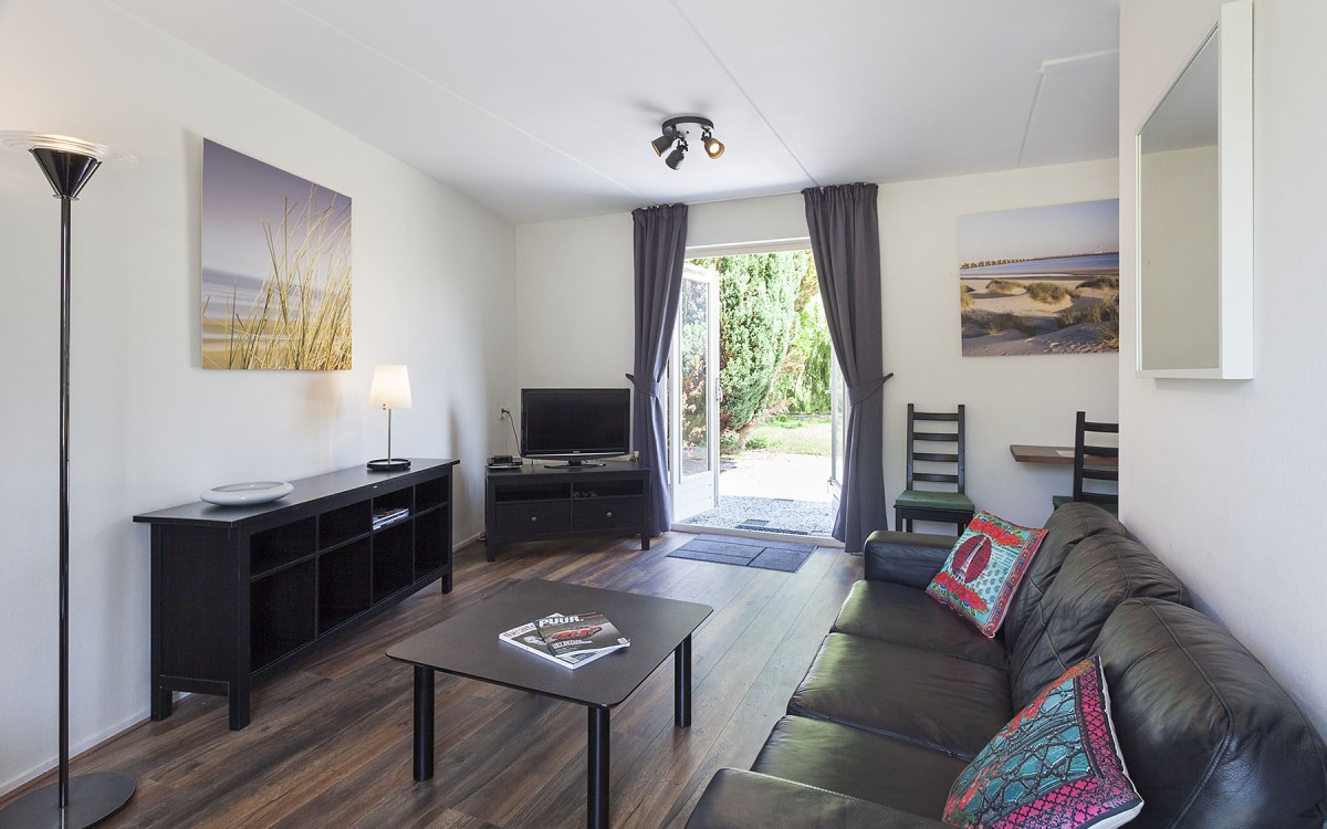 Reizvolles freistehendes 6 Personen Ferienhaus mit viel Freiraum und origineller Einteilung. Eingang mit Toilette, Waschmaschine und in der Bergung ein Bügelbrett und Bügeleisen. Großzügiges Wohnzimmer mit Sitzecke, Flatschreen Fernseher/DVD und Flügeltüren zur eigenen Terasse mit Gartenmöbel und Parasol.