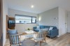 A beautiful spacious six-person house with optimal contemporary comfort. On the ground floor of this tile-covered house is a spacious living room with open kitchen and cooking island, dining area and a spacious seating area. There is also a bedroom with en-suite bathroom, a hall, toilet and a storage room that is accessible via the outside. The high windows with French doors provide a sea of light in the garden-oriented living room. You reach the floor via the stairs in the hall. Upstairs are two spacious bedrooms, each with their own bathroom with toilet, sink and walk-in shower.