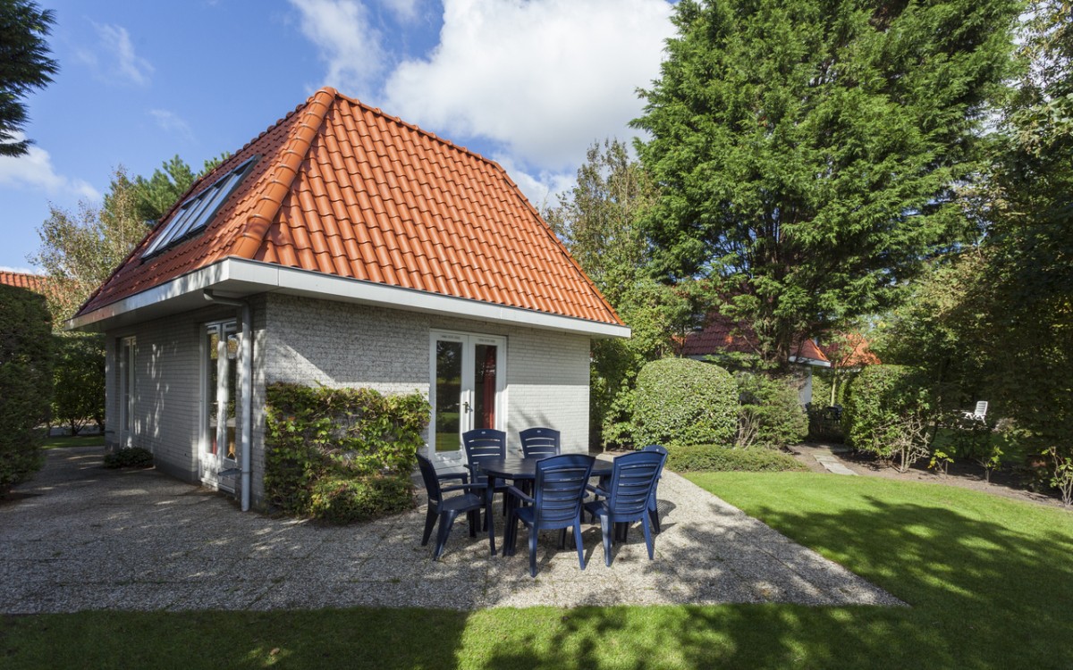 Exquisite 6-person detached villa with plenty of space and creative interior layout. Spacious living room with sitting area, flatscreen TV and French doors to private patio, with 6 garden chairs and a table.