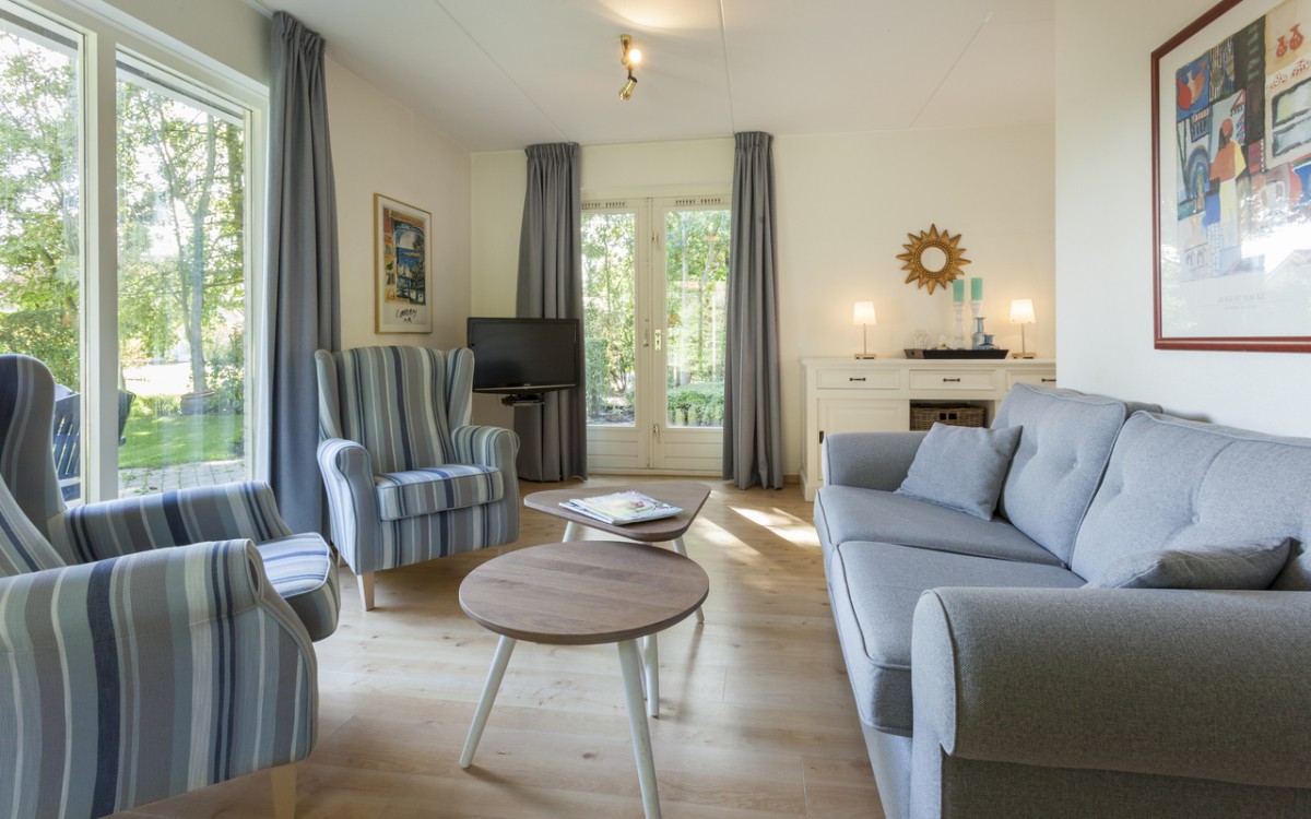 Exquisite 6-person detached villa with plenty of space and creative interior layout. Hall with toilet, washingmachine and in storeroom a ironing board and iron. Spacious living room with sitting area, flatscreen TV and French doors to private patio, with garden furniture and parasol.