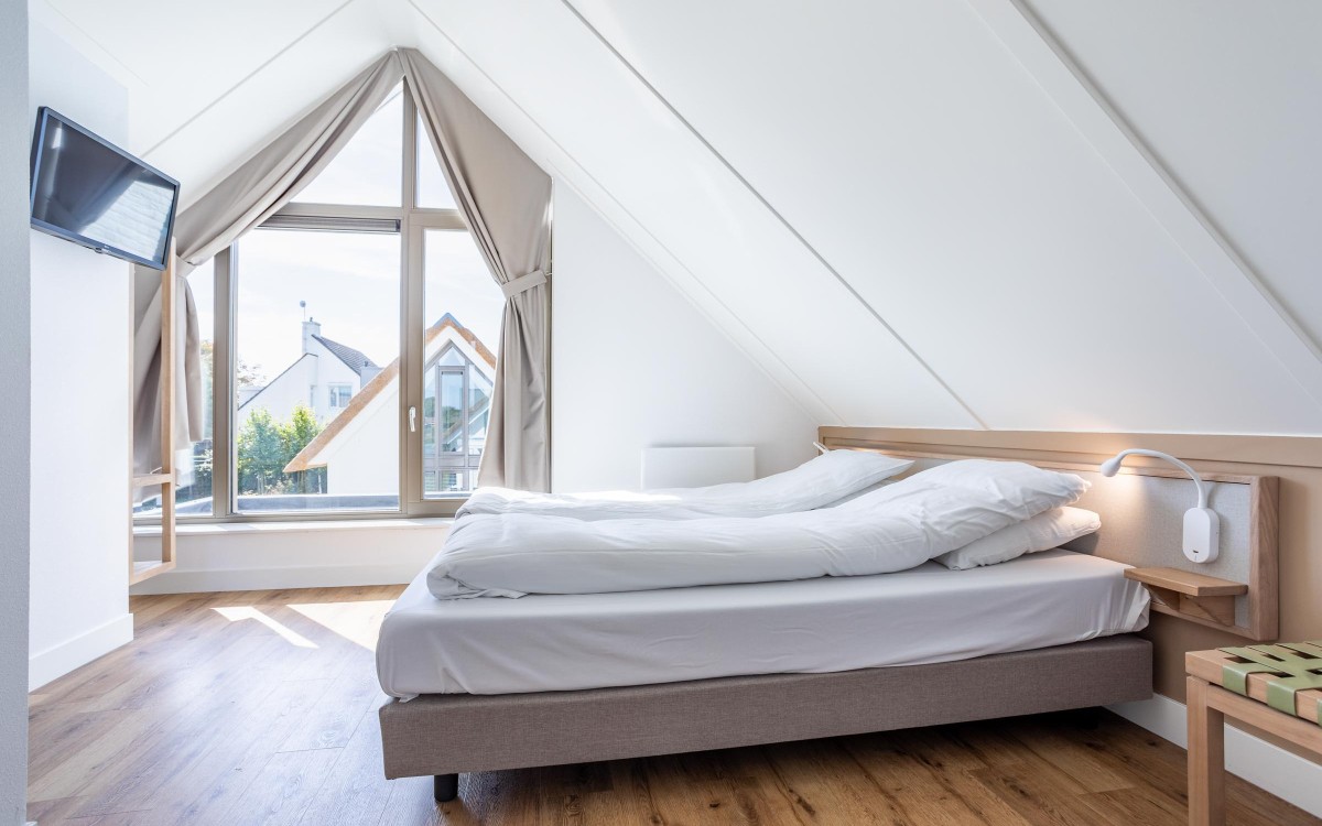A beautiful spacious six-person house with optimal contemporary comfort. On the ground floor of this thatched-covered house is a spacious living room with open kitchen and cooking island, dining area and a spacious seating area. There is also a bedroom with en-suite bathroom, a hall, toilet and a storage room that is accessible via the outside. The high windows with French doors provide a sea of light in the garden-oriented living room. You reach the floor via the stairs in the hall. Upstairs are two spacious bedrooms, and one bathroom with sauna, toilet, sink and walk-in shower.