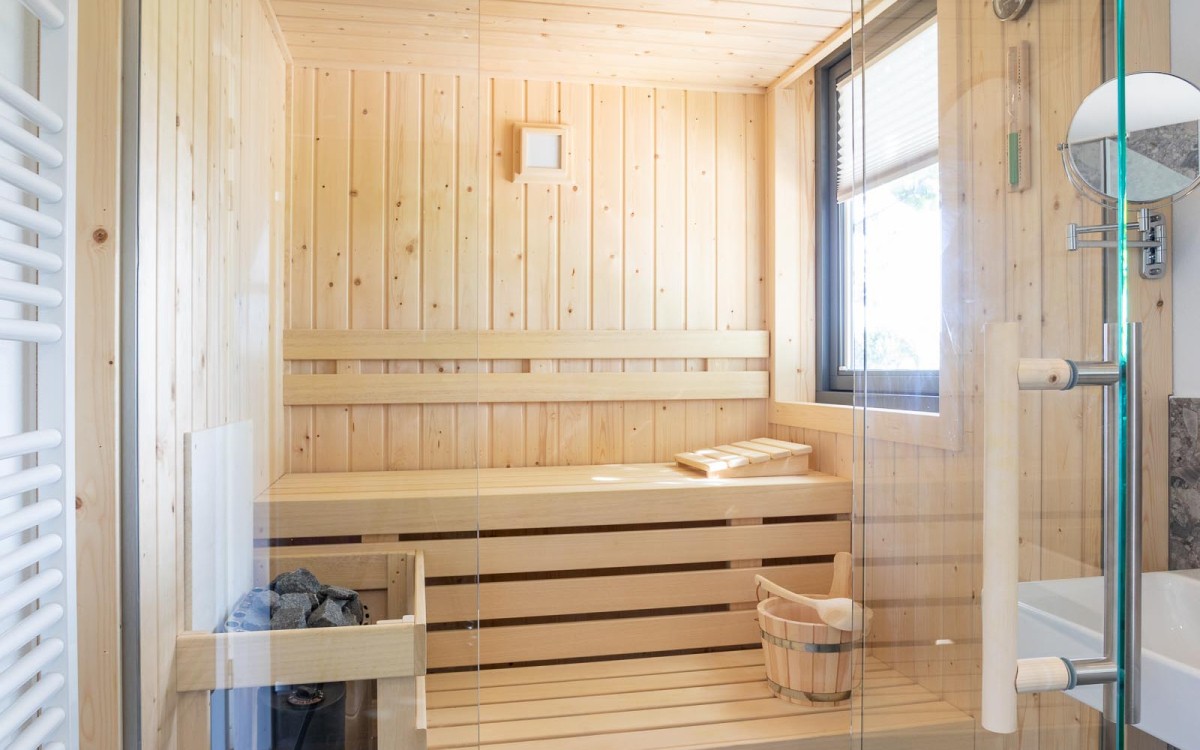 - 1 badkamer met sauna, douche, toilet en wastafel op verdieping