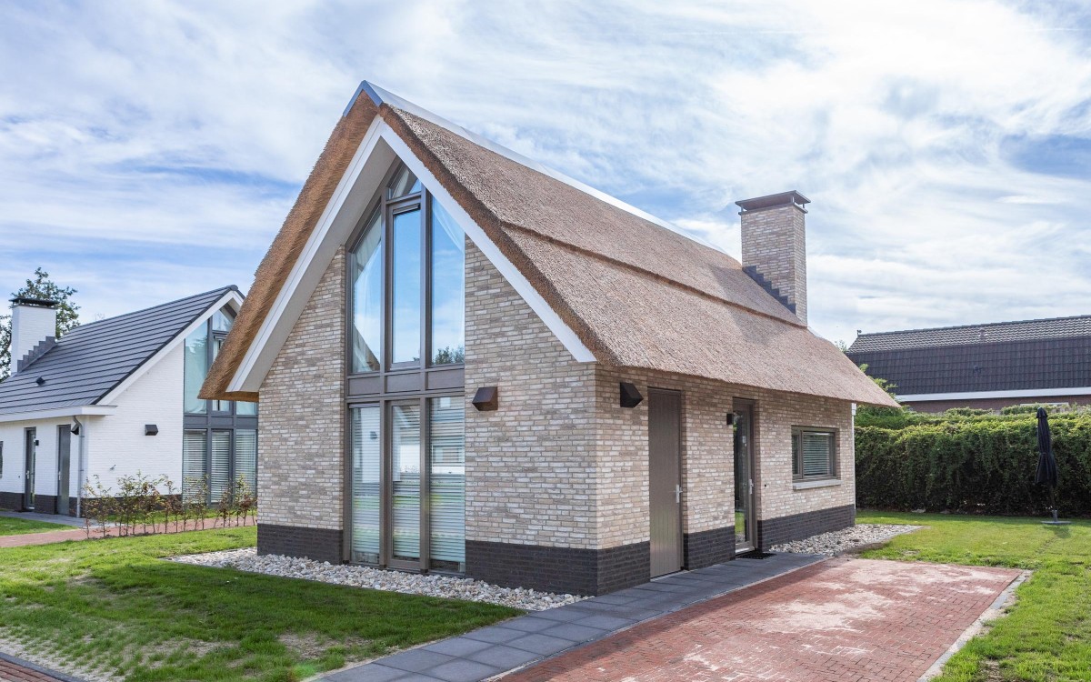 Een prachtige ruime zespersoonswoning voorzien van optimaal hedendaags comfort. Op de begane grond van deze rietgedekte woning bevindt zich een royale living met open keuken en kookeiland, eethoek en een ruime zithoek. Ook is er een slaapkamer met badkamer en - suite, een hal, toilet en een via buiten bereikbare berging. De hoge raampartijen met openslaande tuindeuren zorgen voor een zee aan licht in de tuingerichte living. Via de trap in de hal bereikt u de verdieping.