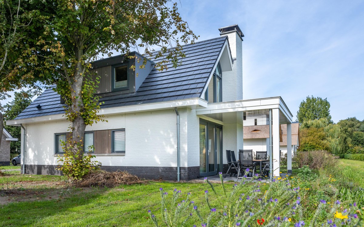 Op zoek naar naar een royale en luxe recreatiewoning van alle gemakken is voorzien? De Putter Extra Luxe heeft als extra een veranda. Ontbijten in de opkomende zon of wat langer buiten zitten; via het door de tuindeuren bereikbare overdekte terras betrekt u "buiten" bij  "binnen". De buitenhaard in de veranda zorgen ervoor dat u heerlijk kunt ontspannen in ultieme buitenplaats. Via de hal met trap en toilet komt u in de indrukwekkende leefruimte met eethoek, kookeiland en zithoek bij de houtkachel. Slecht ter been of wat ouder; ook deze zespersoonswoning heeft een slaapkamer met badkamer en in de douche een sunshower op de begane grond. Op een etage hoger zijn 1 badkamer met sauna en twee slaapkamers.